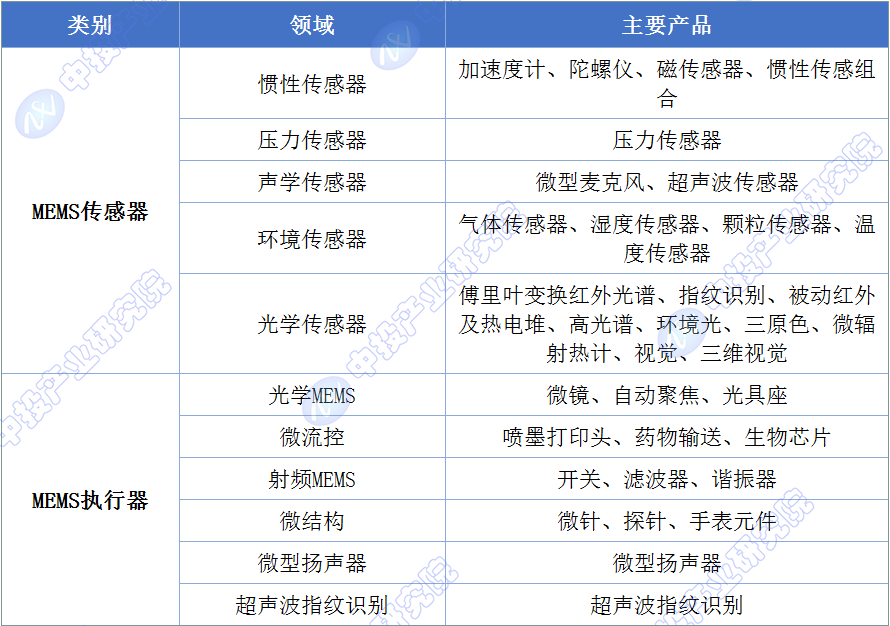 MEMS产品主要可以分为两大类:MEMS传感器和MEMS执行器。MEMS传感器用于探测和检测物理、化学、生物等现象和信号的器件;MEMS执行器用于实现机械运动、力和扭矩等行为的器件。
